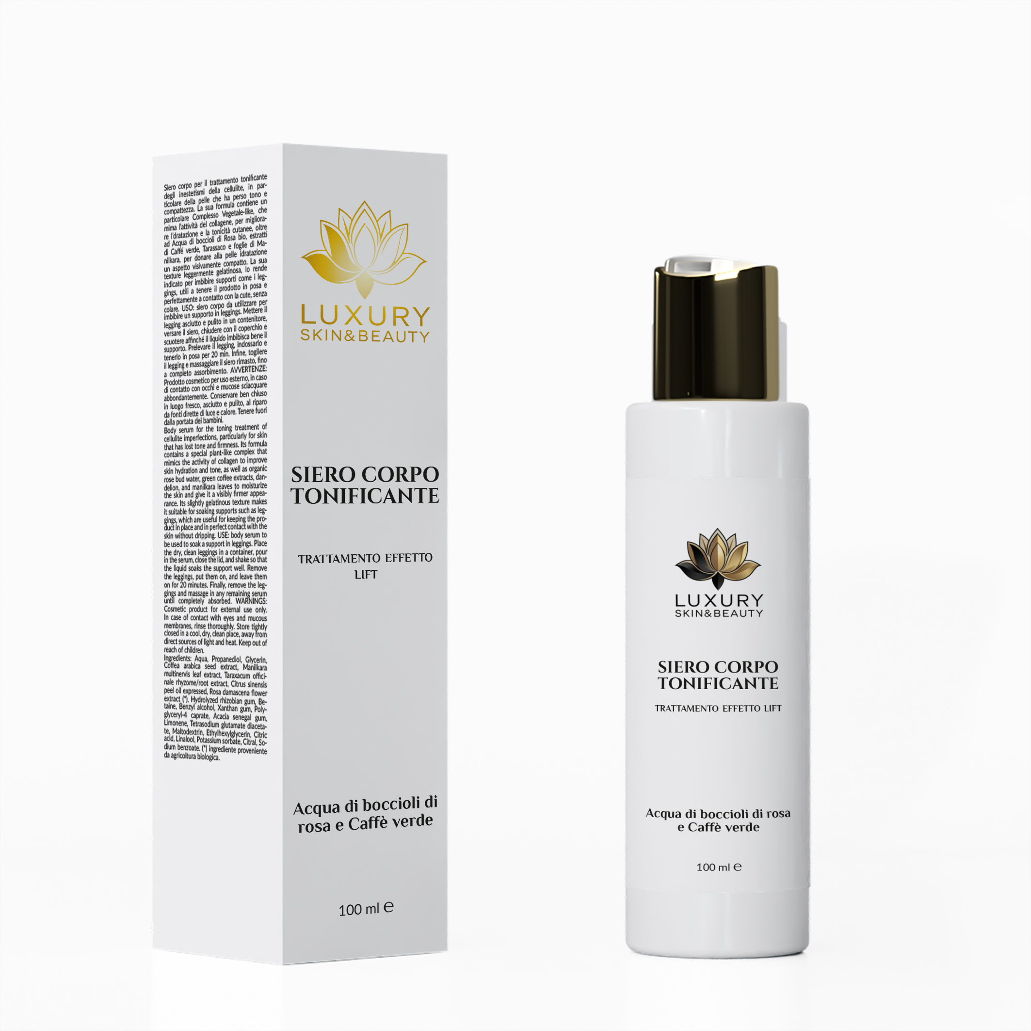 siero corpo da utilizzare per imbibire un supporto in leggings. Mettere il legging asciutto e pulito in un contenitore, versare il siero, chiudere con il coperchio e scuotere affinché il liquido imbibisca bene il supporto. Prelevare il legging, indossarlo e tenerlo in posa per 20 min. Infine, togliere il legging e massaggiare il siero rimasto, fino a completo assorbimento.
